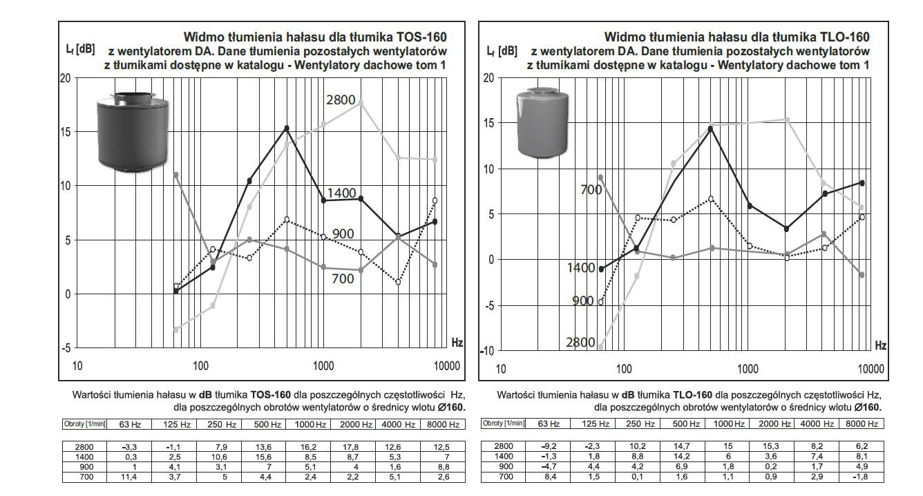 Jeśli wybierając model wentylatora mamy rozpisane te wartości oraz wymagany w obiekcie maksymalny poziom mocy akustycznej po wytłumieniu, precyzyjniej ustalimy, który tłumik do wentylacji mechanicznej będzie optymalny do danego urządzenia. Poniżej prezentujemy przykładowe wartości tłumienia w funkcji częstotliwości dla poszczególnych obrotów wentylatorów dachowych Uniwersal serii DA w dwóch wybranych średnicach wlotu ⌀ 160 i 400.